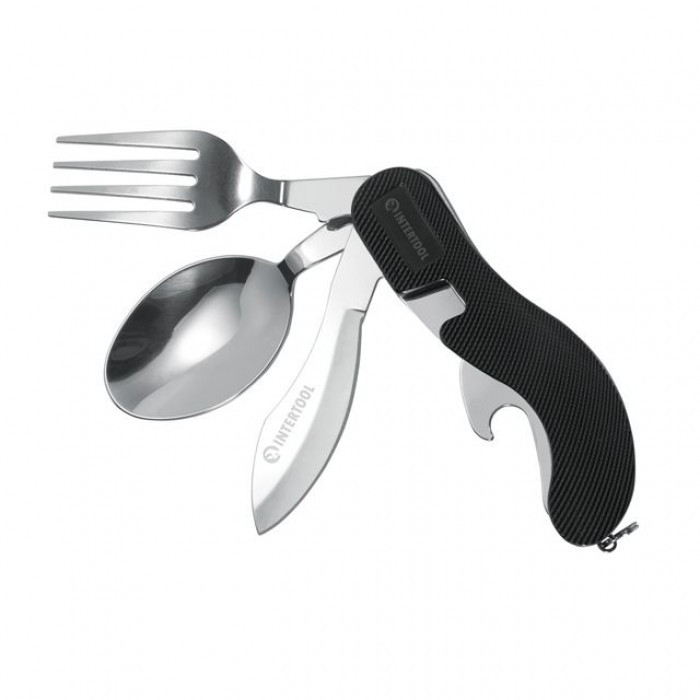 Складаний столовий набір містить найнеобхідніші предмети для приготування та приймання їжі: ніж, виделка, ложка, відкривачка. Стане в пригоді під час походів, пікніків, риболовлі, туризму, у дорозі та в польових умовах. Мультитул туристичний об'єднує кілька інструментів в одному, що дає змогу знизити кількість необхідних речей у поході або подорожі. Це заощадить місце в сумці та знизить її вагу.